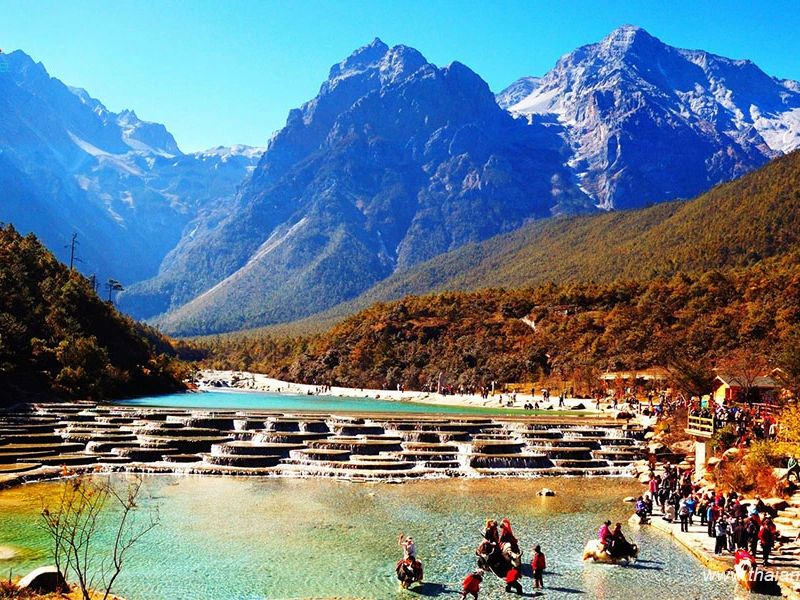 10h30: Đoàn di chuyển đến Lam Nguyệt Cốc thăm quan. Nhắc đến Lệ Giang là nhắc đến những những khu phố cố, lầu đài, đền tháp cổ kính. Thế nhưng, ít ai biết rằng mẹ thiên nhiên còn ban tặng cho vùng đất này một nguyệt cốc tuyệt đẹp. Lam Nguyệt Cốc là một thung lũng nhỏ ngự dưới chân ngọn núi tuyết Ngọc Long hùng vĩ. Dưới ánh mặt trời, nguyệt cốc hiện lên như một vầng trăng màu ngọc bích, đẹp đến nao lòng.
