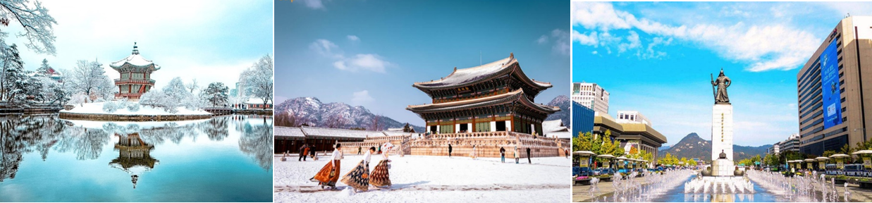 - Quảng trường Gwanghwamun - nơi đặt tượng đài vua Sejong và tướng quân Yi Sun-sin, hai nhân vật lịch sử vĩ đại của Hàn Quốc. Sau đó, dạo bước tại suối Cheonggyecheon - điểm thư giản nổi tiếng giữa lòng thành phố Seoul.